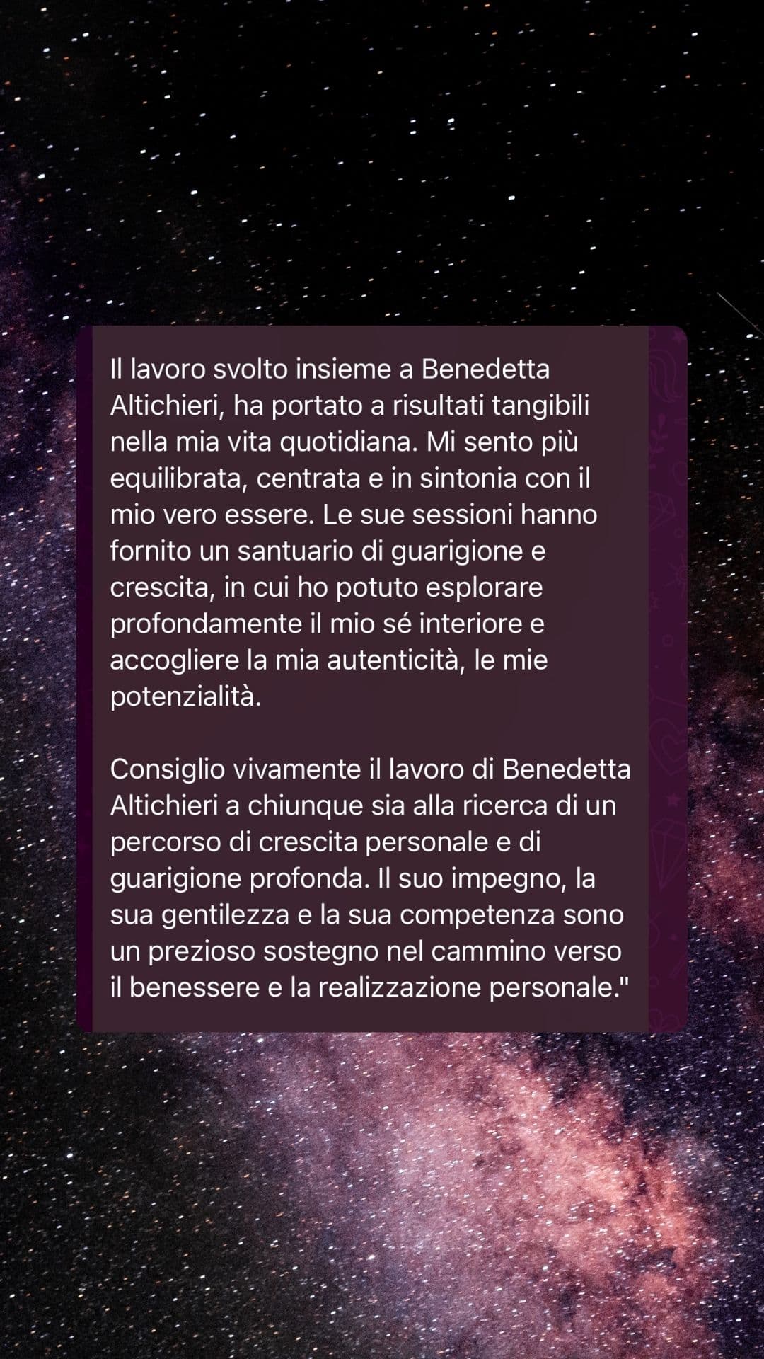 Sono laureata ad Oxford come Brennan Healing Science Practitioner (tecniche psicoenergetiche per la guarigione spirituale ed emozionale), numerologa certificata all'Accademia di Numerologia Sacra, Wabi Sabi Mentor (sciamanesimo giapponese), Moon Mother, studiosa di Sciamanesimo Ancestrale a Montpellier con Patricia WhiteBuffalo, del metodo Soma Breath (breathwork) di Niraj Naik e di Sciamanesimo Birmano e Nat (Antenati) con Selene Calloni Williams.